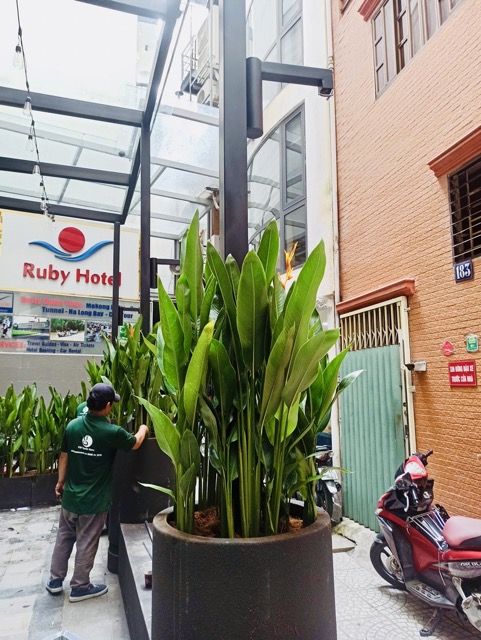 Khi bố trí vào chậu composite chữ nhật và đặt sát theo mép lối đi, chuối mỏ két tạo nên “vách ngăn tự nhiên” giúp khách ngồi cảm thấy riêng tư hơn.