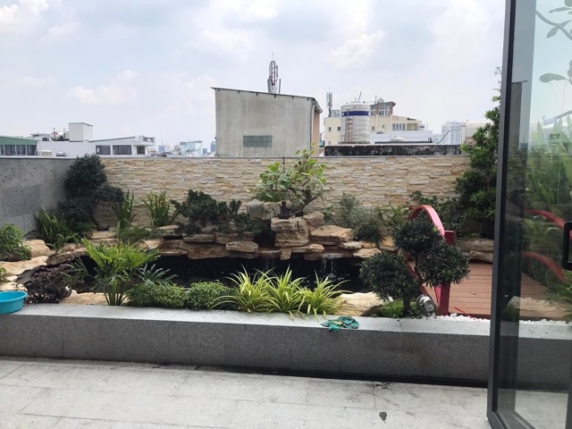 Tiếng nước chảy, cá bơi lội, cây xanh xung quanh tạo cảm giác tĩnh tại – đúng tinh thần phong thủy “an cư mới lạc nghiệp”.